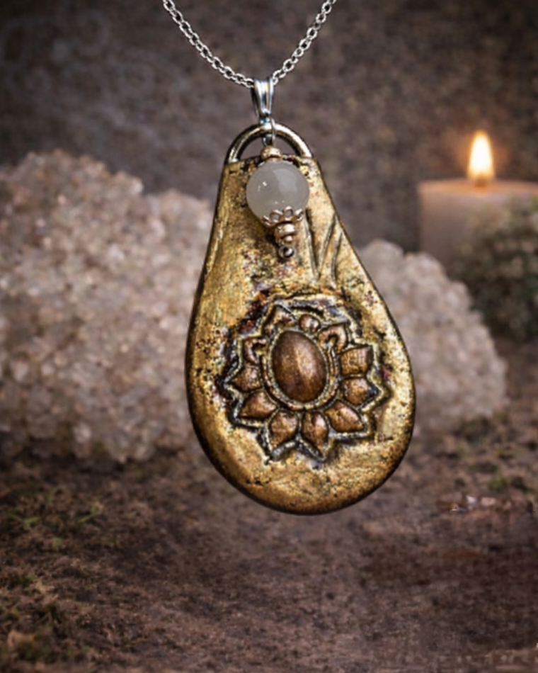 Cette pièce unique révèle au recto un motif floral sculpté dans la matière, évoquant une fleur ancienne née du cœur de la terre. Suspendue avec délicatesse, une perle de pierre de lune vient illuminer le pendentif et apporter douceur et lumière.