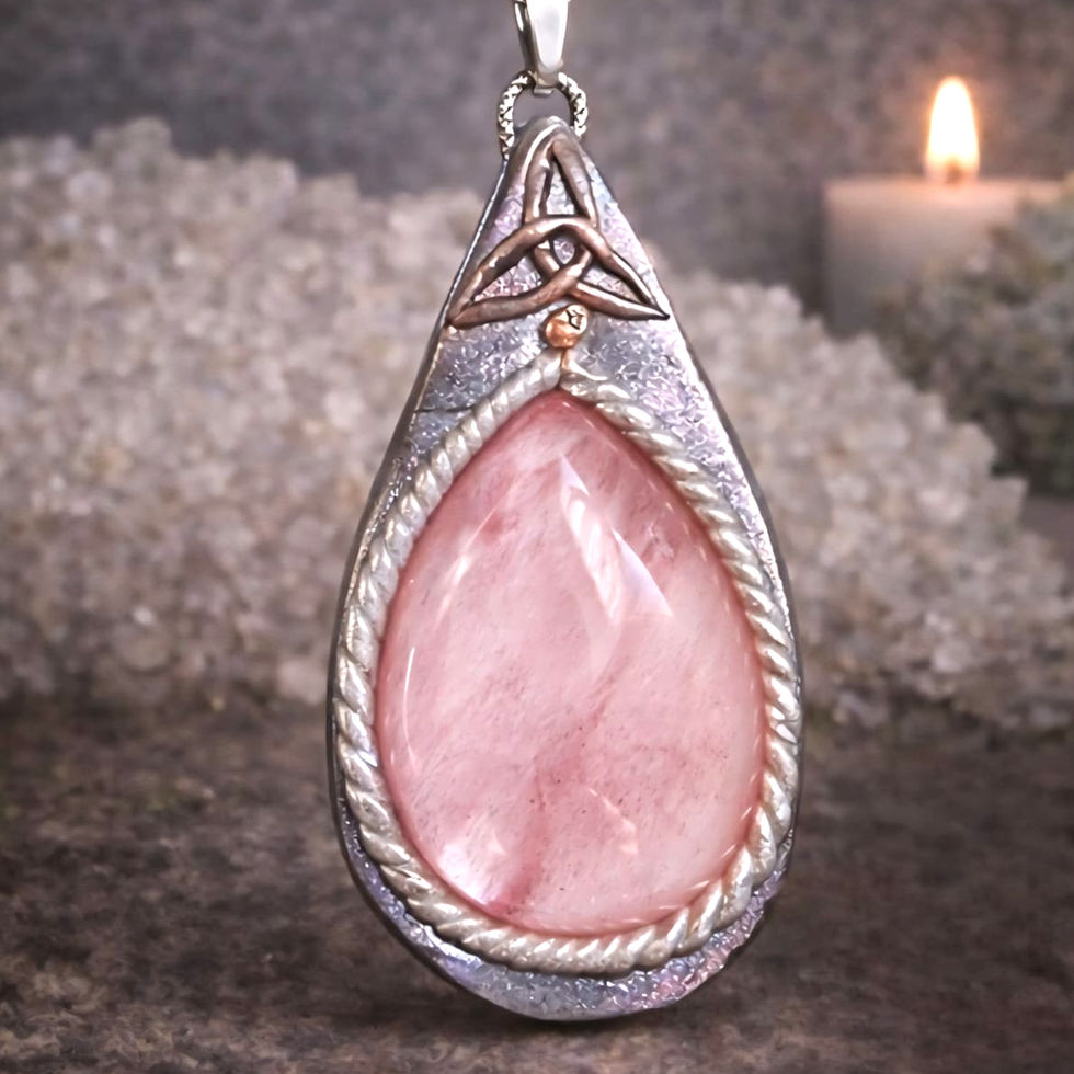 Au centre de cette création se dévoile une magnifique goutte de quartz rose, pierre emblématique de l’amour et de la tendresse. Sa teinte délicatement rosée évoque la douceur, la compassion et l’harmonie intérieure.